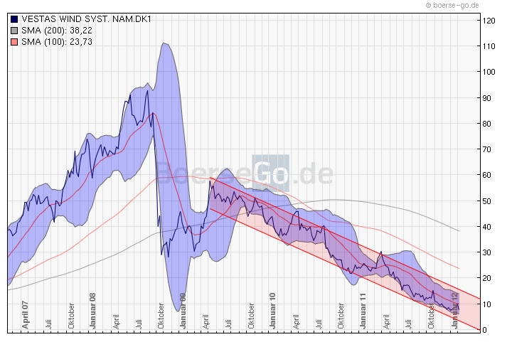 Irgendwie kommt mir diese Story aus anderen Bereichen der Erneuerbaren Energie bekannt vor, da sich die einzelnen Branchen mit den hohen Subventionen doch sehr aufgebläht haben. Natürlich ist Vestas wesentlich gesünder als z.B. eine Q-Cells, doch diese differenzierung machen nicht alle Leute, die jetzt einfach sagen: "Erst Solar, jetzt Wind!" Auch Biogas hat eine solche Krise erlebt, wobei dieser Sektor wirtschaftlich wesentlich kleiner ist, aber bis heute haben sich die Aktienkurse nicht mehr erholt, obwohl der verbliebene Weltmarktführer EnviTec mehr als nur solide und gesund aufgestellt ist. Vermutlich liegt dies hier auch am geringen Freefloat. Hoffe allerdings für Vestas, dass sie nicht ein so dauerhaftes Tief erleben...