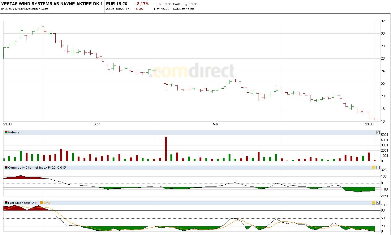 Ich will mal eine Analyse vom Vestas-Chart mitgeben. Fast immer wenn bestimmte Signale als Kauf zu interpretieren wären, macht der Kurs das Gegenteil und umgekehrt.