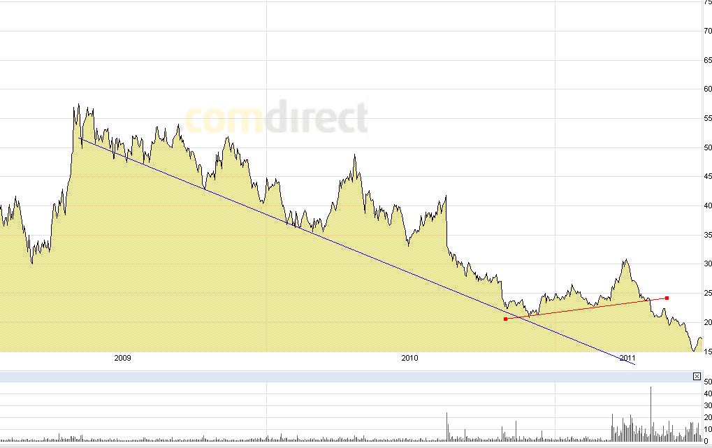 Trendlinien und Handelsvolumen sprechen m.E. für einen langanhaltenten Trendweschel. Wenn nicht wären Kurse um 10 EUR zu erwarten. Das wäre bei dem momentanen Handelsvolumen aber kaum rational logisch. Dann würden alle die im Fallen ab 18 EUR gekauft haben verlieren.