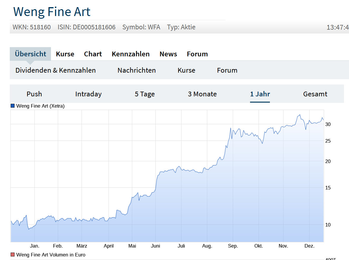 Vorstand Rüdiger K. Weng zur aktuellen Situation: “Wir sind mindestens so euphorisch wie der Kapitalmarkt, wenn wir die Möglichkeiten der Weng Fine Art diskutieren. Wir bauen ein Kunstunternehmen auf, das die wesentlichen Teile des modernen Kunst-Ökosystems umfassen soll. Ein solches Geschäftsmodell hat es in dieser Form im Kunstmarkt noch nicht gegeben. Weiterhin wird es ein Ziel der WFA-Gruppe bleiben, zukünftige Entwicklungen zu antizipieren. Als Investor der WFA-Aktie sollte man trotz des enormen Potenzials jedoch berücksichtigen, dass signifikante Erträge aus den Bereichen ‘Data’ und ‘Blockchain-Marktplatz’ wahrscheinlich erst sukzessive in den Jahren ab 2023 zu erwarten sind. Für die geplante deutliche Steigerung der Umsätze im E-Commerce und im Kunsthandel sind zunächst Investitionen, insbesondere in Fachpersonal, nötig. Das Management wird dabei zu jeder Zeit darauf achten, dass die Profitabilität – ein Markenzeichen der WFA – gewahrt bleibt – dennoch könnte sie zwischenzeitlich abnehmen. Rückschläge bei einzelnen Expansionsvorhaben sind ebenso zu jeder Zeit möglich. Aber auch darauf sehen wir uns gut vorbereitet.”