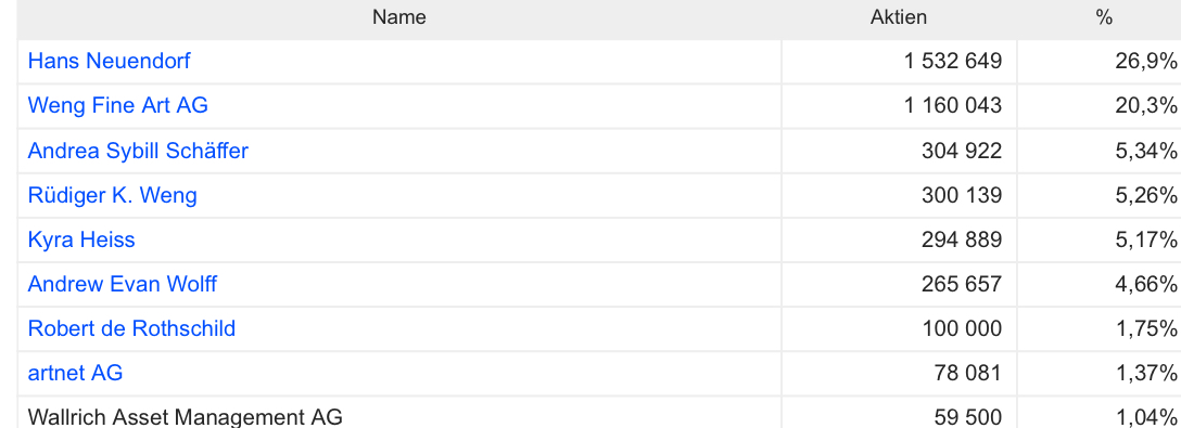 Außerdem macht der CEO doch gerade Nägel mit Köpfen. Der Showdown ist die kommende HV der Artnet AG. Zur Abwahl des Aufsichtsrates hätte man 75% der Stimmen gebraucht, das war nicht zu schaffen. Für die Neuwahl, die nun ansteht, braucht man aber nur 50% der Stimmen, die man bereits auf der letzten HV hatte. Natürlich ist damit zu rechnen, dass Neuendorf wieder versucht Stimmrechte zu kaufen, was sie ja schon mal getan haben.