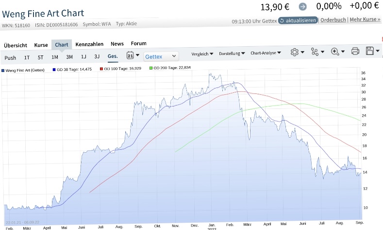 ps: zum Thema vertrauen (darauf kommt es ja hier an): geh mal auf die WFA website und les dir mal die Meldungen vor ein paar Jahren durch. das wirst du sehen, dass der ceo auf divi verzichtet hat um andere aktionären mehr zu geben! das man trotz delisting exakt gleich gut und transparent kommuniziert hat usw. also Zeit mitbringen, mal zu einer HV fahren und dann investieren. Denn eins ist klar: würde ich Herrn Weng nicht vertrauen, würde ich hier 0 Euro investieren...es ist eben keine Normale Aktie mit prognostizierbarem Gwschäftsmodell. Es ist die Frage: glaube ich, dass WFA den Kunstmarkt für Investoren erobert? Wenn ja, sind die 50 nach split nur eine Zwischenstation...