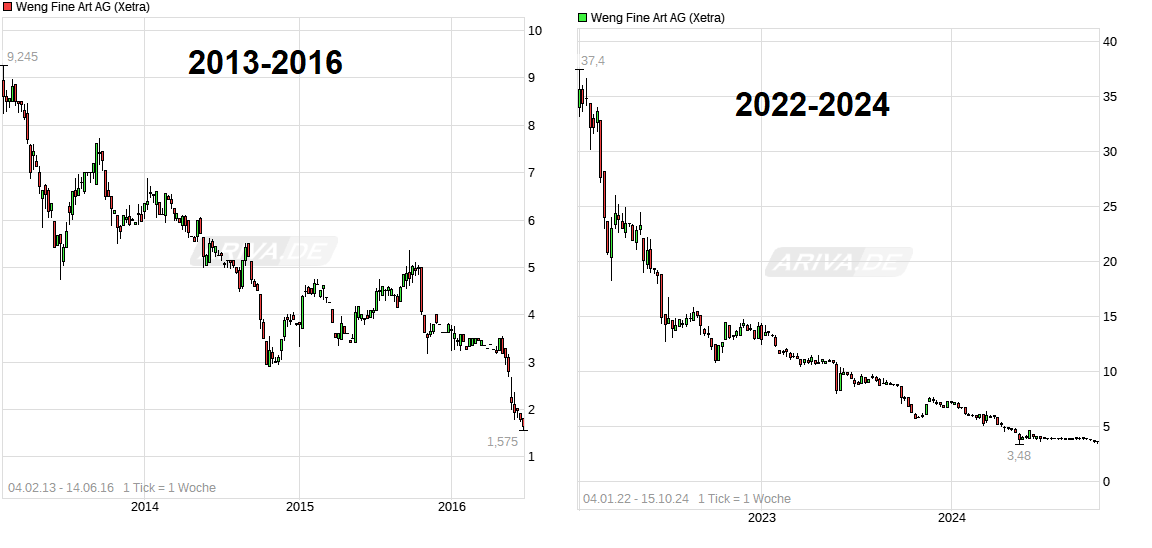 Der Kurs wird anderswo gemacht, richtig. Allerdings nicht von Herrn Weng - sondern vom Geschäft und dessen Entwicklung. Und selbst wenn sich Herr Weng auf den Kopf stellt und mit den Füßen wackelt: Zum Kauf von Kunst zwingen kann er nun mal niemanden. Insofern kann er auch nur alles in seiner Macht stehende tun, was den Verkauf betrifft - und darüber hinaus wird auch er leider nur Geduld haben können, bis sich das Marktumfeld bzw. die Stimmung allgemein wieder drehen. Es wäre insofern naiv anzunehmen, er müsste einfach nur ein paar Stündchen mehr arbeiten - und schon sähe alles ganz anders aus ...