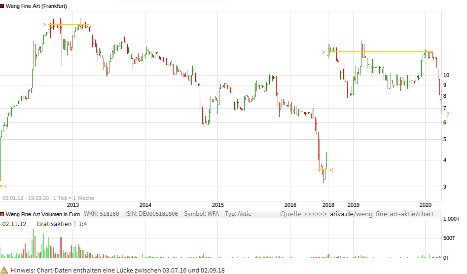 Auch ist die Eigenkapitalquote und der Cashbestand hoch. Die Kreditlinien, also auch die noch nicht genutzten Kreditlinien sind hoch. Herr Weng war immer sehr vorausschauend und hat lange Zeiträume mit einkalkuliert, wo die Geschäfte schlecht laufen könnten. Das macht sich jetzt bezahlt. Er hat immer vorsichtig agiert was das Wachstum betrifft. Zuletzt wurde ja das Eigenkapital stark gestärkt. Es besteht also nicht die Gefahr, dass man so schnell unter eine Eigenkapitalquote von 30% rutschen könnte und damit Kreditvereinbarungen reißt. Der Zukauf bei Artnet wurde zuletzt allein aus den kurzfristigen Zahlungszuflüssen aus dem reinen Kunsthandel gestemmt. Also ohne Fremdmittel und Substanz. Im Gegenteil man hat nun die Möglichkeit Opportunitäten zu ergreifen. Wie beispielsweise Aufstockung bei Artnet, die mangels Cash große Schwierigkeiten bekommen könnten. Inwieweit das Geschäft der WFA durch das Coronavirus leidet muss man sehen. Klar ist, dass die WFA ein Ecommerceunternehmen ist. Also das meiste online geregelt wird. Liefererketten können nicht durchbrochen werden, direkten Kundenkontakt gibt es kaum. So gesehen können hier die Geschäfte normal weiter laufen! Inwieweit die potentiellen Käufer im Zeichen des Coronavirus Kunst kaufen muss man sehen. Auf jeden Fall werden keine Lieferketten abgeschnitten, grundsätzlich könnte alles so weiter laufen, wie bisher. Insoweit wird ein Einbruch nicht so stark sein, wie bei anderen Unternehmen. Die Pornoindustrie ist ja ein Coronavirus Profiteur, da die Leute Zeit haben und viel Bezahlpornos schauen. So gesehen haben die potentiellen Käufer von Kunst nun auch Zeit und könnten übers Internet Kunst vermehrt bestellen. Inwieweit das positive Aspekte auf das Geschäft von WFA gibt gepaart mit negativen Aspekten, weil nun auch aufgrund Vermögensverlusten bei den Kunden die Bereitschaft sinkt Geld für Kunst auszugeben, muss man sehen. Auf jeden Fall kann das Geschäft der WFA grundsätzlich so weiter gehen wie bisher, was ja die meisten Unternehmen nicht sagen können. Auch hat die WFA brilliante Kostenstrukturen, wie kaum ein Unternehmen und auch bilanziell, also Eigenkapital und Kreditlinien ist die WFA bestens aufgestellt. Von dem her würde die WFA auch Frostzeiten, wie kaum ein anderes Unternehmen, gut überleben. Hinzu kommt, dass ich aus besagten Gründen davon ausgehe, dass man profitabekl bleibt. Also kein Angriff auf die Substanz. Im worst Case fällt der Gewinn kleiner aus. Ja man sollte auch dividendenfähig bleiben. Im best Case könnten die Geschäfte durch den Coronavirus auch befeuert werden, da nun vieles weg von den Galerien hin nach online geht und die Leute mehr Muse haben Kunst zu kaufen.