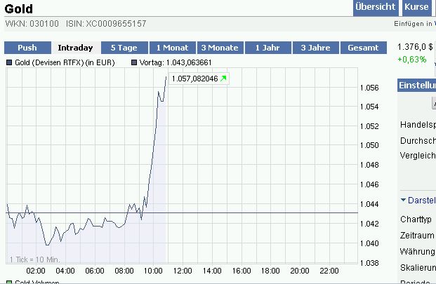 im übrigen hatte ich als euro ATH in meiner statistik am 08.06.2010 einen euro/dollarkurs von 1,1920 und einen goldkurs von 1250,30 dollar macht also 1048,91 euro pro unze. aber nu ham wir das ja doch geknackt.