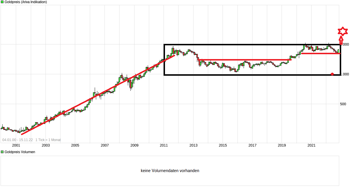 Es wird ein typischer Break out werden, ohne Vorwarnung!!! Es gibt wunderschöne Langzeit - Charts bei Ariva. Und wenn man die Charts genau betrachtet, steht Gold kurz vor einen Ausbruch aus einer langen Darvas Box. Solche Ausbrüche treten immer spontan auf. Mein Ziel bis 2028 sind 5000$