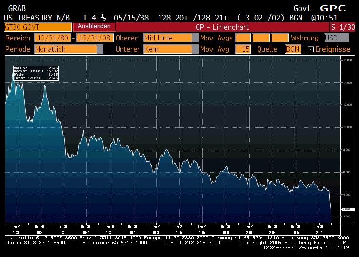 Hier der Verlauf der Verzinsung von US-Staatsanleihen mit 30jähriger Laufzeit von 1980 bis Ende 2008