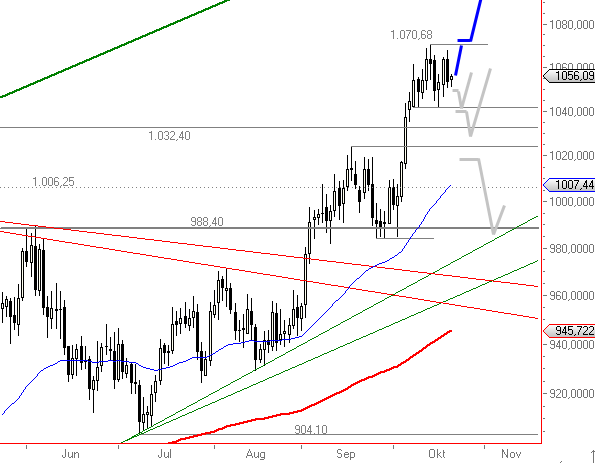 Rückblick: Gold brach Anfang Oktober dynamisch über das Hoch aus 2008 bei $1.032,40 aus und generierte damit ein kurz- bis mittelfristiges Kaufsignal. Bei $1.070,68 wurde ein neues Allzeithoch markiert und eine Zwischenkorrektur gestartet, welche bislang auf hohem Niveau verläuft. Gestern kam es dabei zu einem größeren Rücksetzer innerhalb der Handelsspanne der letzten Tage, heute stabilisiert sich Gold wieder. Das Chartbild ist auf dem hohen Niveau nach wie vor bullisch zu werten.