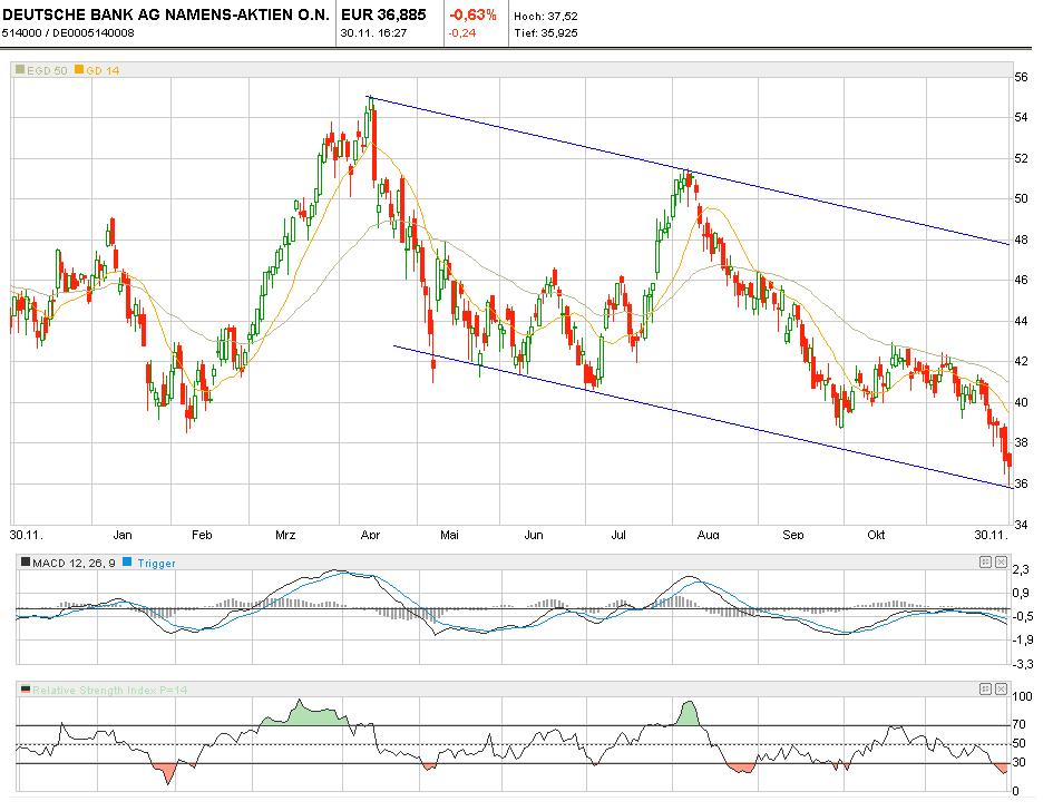 Es ist schwer zu sagen ob wir die untere Begrenzung erreicht haben oder nicht. In meinem Trendkanal würde ich sagen das wir den Trend heute Intraday erfolgreich getestet haben und ein 36er - 37er Kurs ein guter Einstieg währen. Aber: