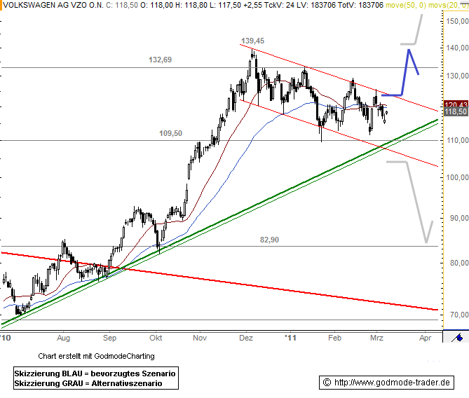 Mittwoch 13.04.2011, 08:55 Uhr Der langfristige Chart der Volkswagen-Aktie strotzt geradezu vor Stärke. Ein beeindruckender Aufwärtstrendkanal führt den Kurs seit November 2008 beständig weiter nach oben. Auch die Konsolidierung der letzten Monate hat einen bullischen Charakter, denn obwohl der Kurs seit dem Hoch im Dezember 2010 rund 25% an Wert verloren hat, deutet die bullische Flaggenstruktur der vergangenen Monate auf eine baldige Fortsetzung des übergeordneten Aufwärtstrends hin.