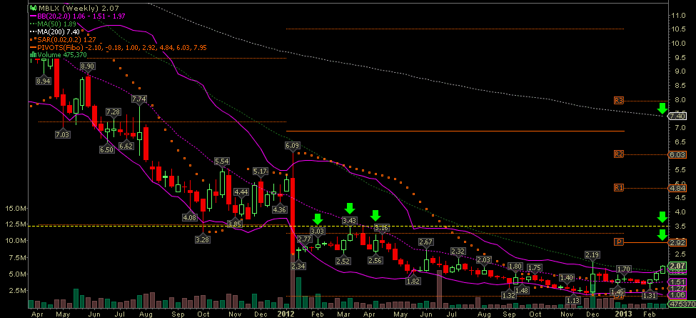 MBLX im daily chart hat sie alle Gewinnziele ausgereizt, die wahrscheinlich waren, da sie long ist ("investor") löst man sich nun von den kurzfrsitigen Zielen und schaltet auf weekly, bei long immer auch den weekly betrachten. Da löst sie sich aus einer mehrmonatigen Talsohle, die vor ca. 1 Jahr durch einige Kurshochs noch oben begrenzt ist, die liegen bei etwa $3.03 - $3.16 - $3.43 zugleich liegt der aktuelle Pivotpoint bei $2.92 Das ist das long Nahziel, also ca. +30-40% WENN sie das erreicht und tatsächlich aus der Talsohle aufsteigt, kann man damit zufrieden sein. Das Maximalziel bei einem fulminanten Ausbruch vom Typ "rocket" liegt in der Nähe der 200 Tageslinie bzw. fibo 3 Widerstand bei $7.40-$7.95, das sind Jubelziele, die eher unwahrscheinlich, aber nicht ausgeschlossen sind. Wichtig ist, das sie einen Trend etabliert. Den kann man heute nicht sehen und man kann auch nicht wissen, ob er kommt. Aber die Aussichten sind nicht schlecht und wir müssen vor dem Trend vor Ort sein, das ist die Herausforderung des chartens. Wenn sie erst mal hochgelaufen ist, sieht es jeder und dann kauft man die shares der Aussteiger. Wir kaufen keine Aussteiger shares, aber man geht natürlich das Risiko ein, dass sie die Trendetablierung nicht packt und muss dann ggf. die Reißleine ziehen. Nur m.M./keine Empfehlung. Gruß