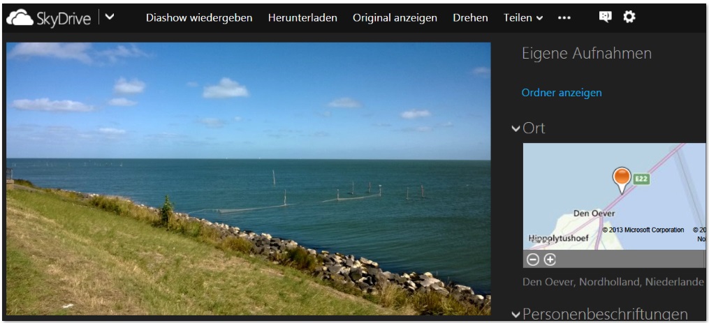 wenn man sich dann später fragt, hmm... wo/wann war das noch mal gleich? *grübel* dann sieht man auf skydrive anhand der GPS Position, ah! genau, auf dem Ijsselmeer-Abschlussdeich in Nordholland... wusst ichs doch! jetzt fällts mir wieder ein :-) Gruß
