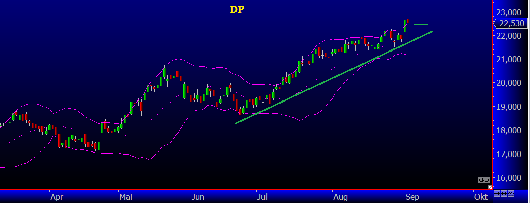 22? das ist ja mitten in der BB Mitte, noch knapp im oberen Band, o.k., jetzt kann ich die Aufregung verstehen! 21,86 ist die 20 Tageslinie, hmm, da drüber zu kaufen, würde aber sagen wir sehr optimistisch sein oder? denn das obere Band braucht sie allein, um im Trend rauf und runter zu schaukeln... zeimlich dicht! na, Glück auf!