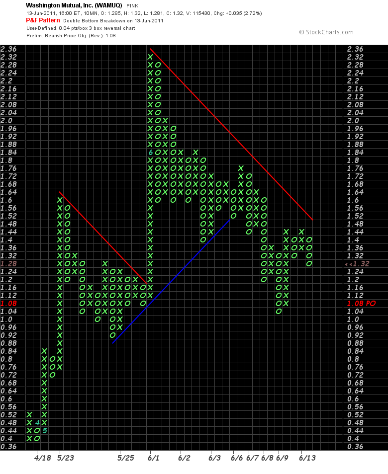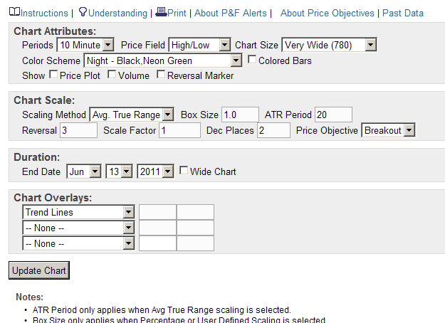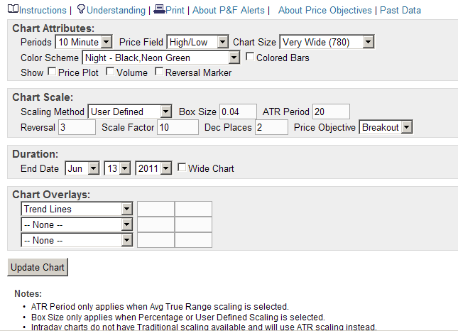 ist in Einstellung "10 Minute", Boxgröße $.004, da der Kurs mit 10 multipliziert wird ("Scale Faktor" = "10" statt "1"), kommen auf die Y-Achse brauchbare Zahlenwerte, die das Programm annimmt ("ihm Pennystocks schmackhaft machen" :-) daher beträgt die "User Defined Boxsize" nicht "0.004" (was er nicht annimmt), sondern entsprechend 0.004*10 = "0.04", 0.04 macht auf der umskalierten Y-Achse die gleichen Schritte wie 0.004 auf den korrekten Kurs bezogen. Die "ATR period" entfällt bzw. bleibt einfach auf "20" stehen.