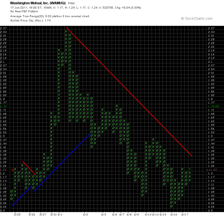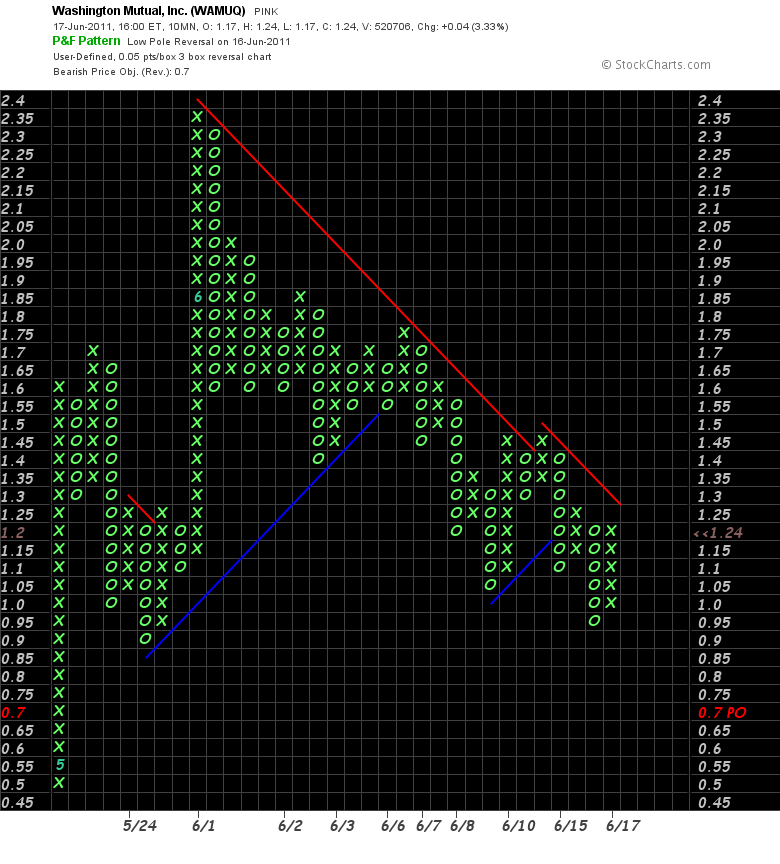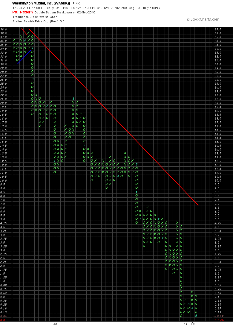 Der Wert blieb bis heute im Abwärtstrend und landete bei 0 (fast Null ~4-12 Cent im Vergleich zu mehreren Zehner $ /share ist fast Null) D.h. ab dem Punkt "letzte Eisenbahn" (spätestens) hätte man einen solchen Wert nicht mehr "long" gehalten, wenn man ein chartbewusster longi gewesen wäre, da das Schlachtfeld zwischen Bullen und Bären sich so verlagert hat, dass man "defensiv" agiert und eine long Position in einen Abwärtstrend von washington mutual zu platzieren ist nicht gerade das was man unter "defensiv" versteht, sondern höchst riskant.