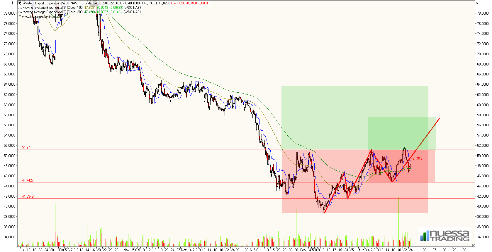Die Chancen waren aber zu verlockend für mich, einen kleinen Gewinn mitzunehmen anstelle zu pyramidieren. Auf der Oberseite sind Kurse von 57 $ und sogar 64 $ zu erwarten. Nach unten sollte die Aktie nicht mehr unter 41 $ schließen.