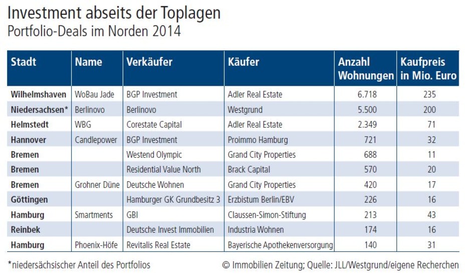 Die größten Abschlüsse bei den Wohnportfolios 2014 listen JLL und Westgrund jedoch primär abseits der bis dato wachstumsstarken Regionen auf (siehe Tabelle "Investment abseits der Toplagen" auf dieser Seite). So kaufte die Adler Real Estate im Oktober für 235 Mio. Euro die WoBau Jade in Wilhelmshaven und hatte Anfang des Jahres bereits 2.349 Wohnungen in Helmstedt erworben. Damit kaufen Adler, Westgrund oder Grand City Properties Wohnungen in ungeliebten, aber günstigen (Groß-)Wohnsiedlungen der 1960er und 1970er Jahre.