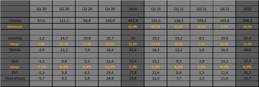 Bin grad dabei, meine Tabelle vor allem in den einzelnen Quartalen für 2021 zu aktualisieren. Durch diesen extremen Vorsprung des Q1 für die Jahresprognose des AEbitda kann bei der Umsatzprognose des Vorstands eigentlich keine Marge unter 11% rauskommen, selbst wenn man ab sofort mit stark steigenden Marketingkosten rechnet. Das ist mir ein absolutes Rätsel, wie man da auf 8-10% kommen will, jedenfalls nicht wenn man beim Umsatz mit fast 550 Mio € rechnet.