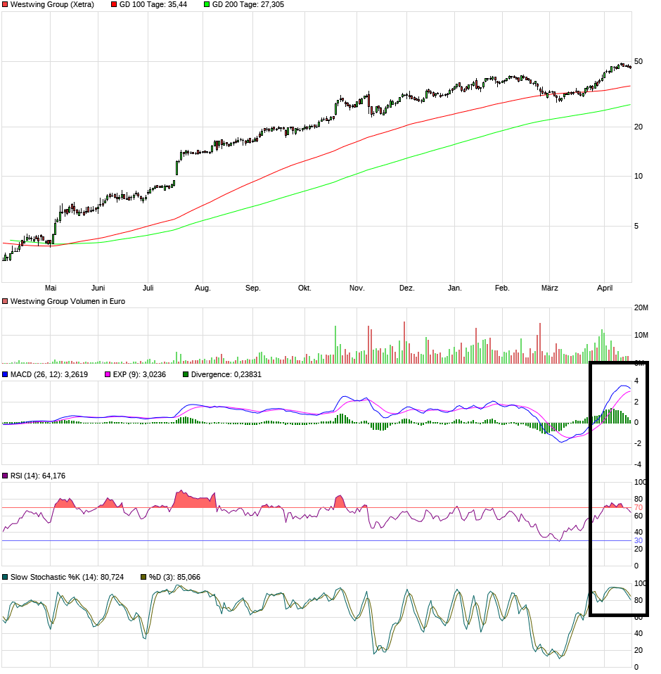 Was Indikatoren angehen, finde ich nach wie vor "überkauft" keinen sinnvollen Begriff. Hatte ich dir ja schon mal geschrieben. Ein hher RSI und MACD ist an sich ein bullishes Zeichen. Sonst müssten ja immer ausgerechnet Trendaktien fallen, die oft monatelang einen RSI von 70 und höher haben. Und der MACD ist eh nie überkauft, sondern da geht es um die entsprechenden Signale bei Kreuzung.