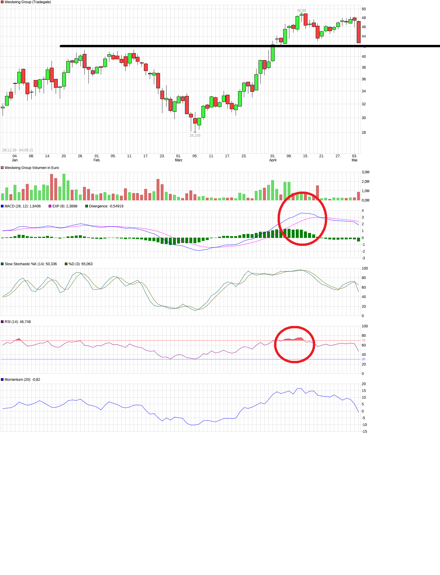 Mich interessiert Charttechnik aber ohnehin nur als Unterstützung der Fundamentalanalyse. Das heißt, ich schaue mir klare Trends und Unterstützungen an. Wenn eine Aktie so dermaßen günstig bewertet ist wie Westwing, dann reicht es mir aus, mir den Uptrend anzuschauen und die ehemaligen Hochs bei 41,5 €. Alles andere ist uninteressanter Kleinkram.