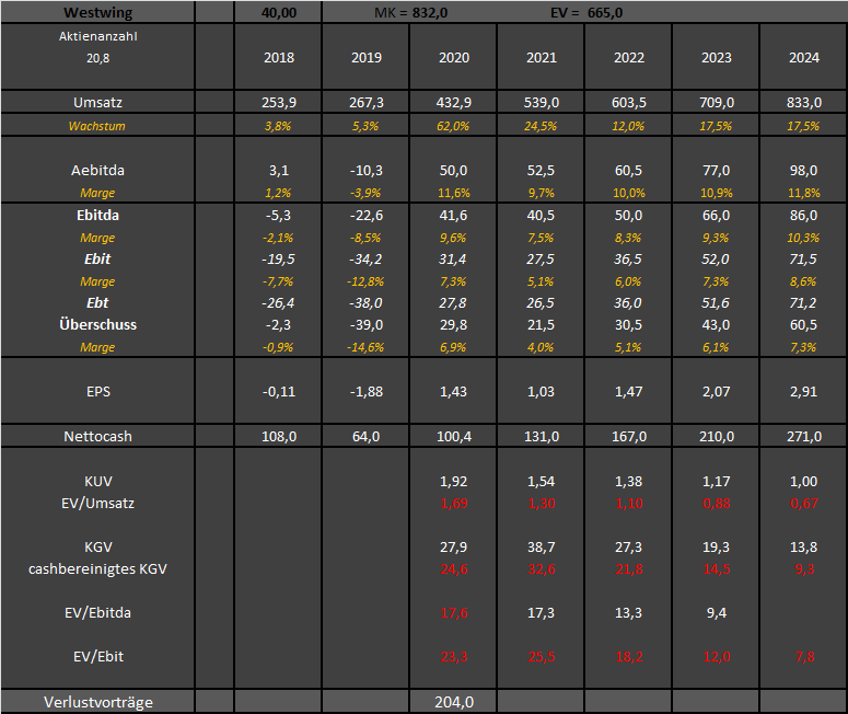 Selbst wenn ich nur EV/Umsatz 1,5 für Westwing fürs kommende Jahr ansetze, kommt man ja schon auf einen fairen Wert von 52 €. Und ich wüsste nicht, wieso Westing nur das gleiche KUV haben sollte wie Home24. Weder wächst Home24 übergeordnet stärker, noch hat Home24 die hohen Margen von Westwing und wird sie auch die nächsten 5 Jahre sicher nicht erreichen.