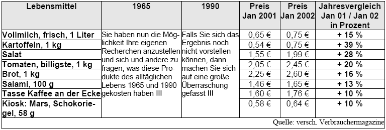 nur die Leute ,die wirklich rechnen müssen,wundern sich,dass es trotzdem jetzt vorne und hinten nicht reichen will...man geht einfach nicht mehr in die Kneipe oder ins Restaurant und spart beim Urlaub ,das Auto wird länger gefahren und viele Sachen kosten doppelt soviel wie zu DM-Zeiten !
