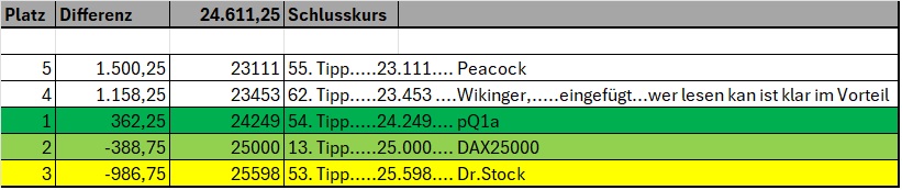 Das alte Tippspiel neigt sich ebenfalls dem Ende entgegen, Zeit sich für das neue Jahr Gedanken zu machen. Geht es bis zum Jahresende 2025 nach oben, oder sehen wir tiefere Kurse oder bleibt alles so wie es ist ? Wir sind auf die Gewinner 2024 schon jetzt gespannt.