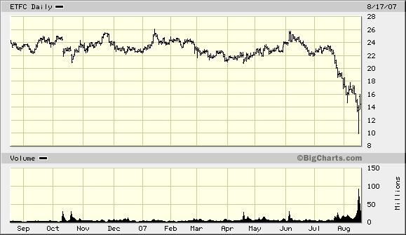 Troubles in the mortgage market have spread across other credit markets in recent weeks, disrupting some companies' access to borrowing. While E-Trade (ETFC) isn't a mortgage company, it holds a portfolio of mortgage-backed securities worth more than $10 billion. The company also originates some home loans.