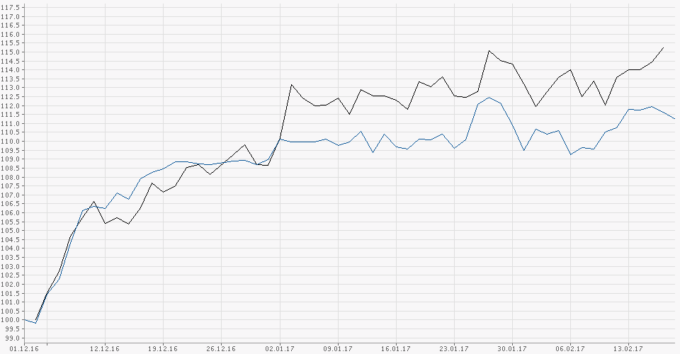 Anbei noch der Chartvergleich mein Wikifolio (seit Emission) vs. DAX