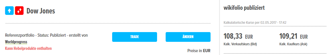 Ich habe ein neues Wikifolio "Dow Jones" erstellt. Es ist ein Hochrisikowikifolio, denn es werden nur Hebelzertifikate gehandelt...