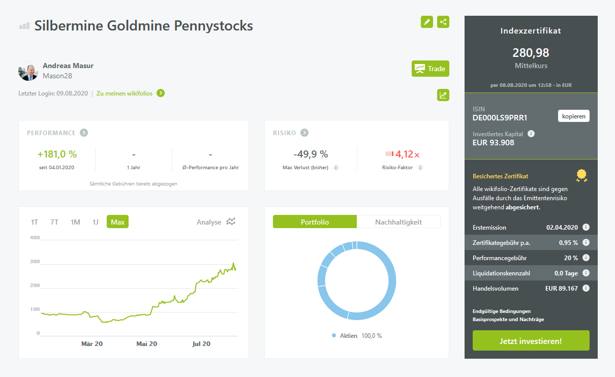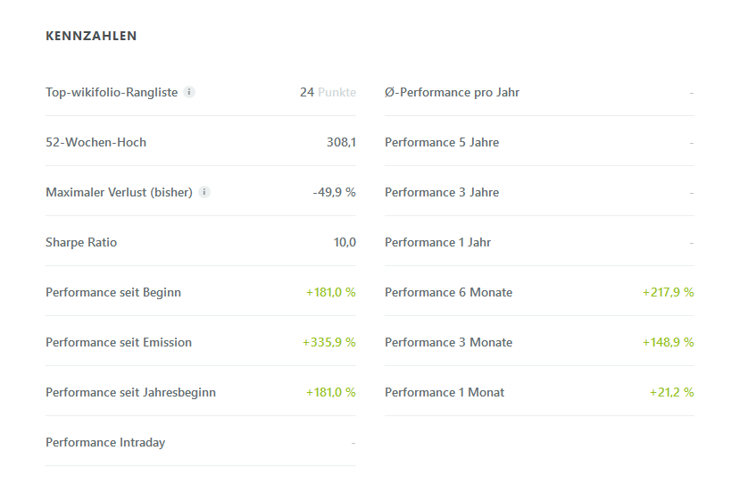 Die Erstellung war am 04.01.2020 und die Erstemission am 02.04.2020. In dieser Zeit entwickelte sich eine Aktie zu einem Tenbagger und es hat die Auszeichnung High-Performance verliehen bekommen.