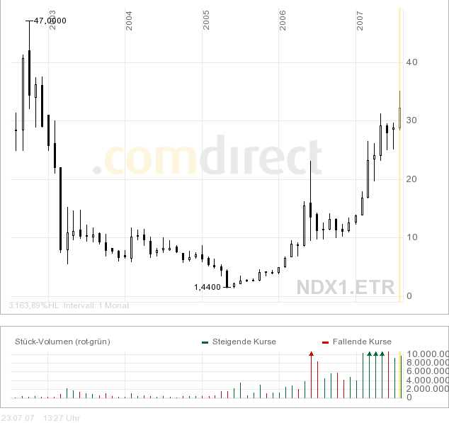Im Index der Technologieaktien sind wieder einmal Aktien der Branche Alternative-Energien besonders gefragt. Die Solarwerte Solon AG (WKN 747119) und Solarworld (WKN 330400) legen 2,6 bzw. 3,1 Prozent zu. Absoluter Kurstreiber ist aber die Aktie von Nordex (WKN A0D655). Das Tagesplus liegt im Moment bei 6,3 Prozent. Mit einem Handelsvolumen von 25,8 Millionen Euro entfällt damit fast ein Viertel des heutigen gesamten Handelsvolumens aller 30 TecDAX-Werte von 114 Millionen Euro auf Nordex.