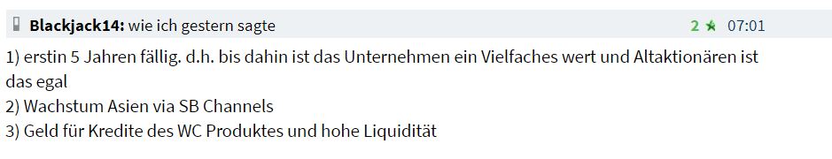 Stückzahlen und Kurse, Kursziele, Pushphantasien und Basherschwachsinn zu posten. Die Extremen ausblenden, die Fakten bewerten, schon wird es vernünftig. Der Rest sind Neurosen, wer es braucht. Der regelmäßige Schwanzvergleich mit Derivaten oder hohen Stückzahlen hier wirkt jedenfalls armselig auf mich. Sympathisch dagegen jene die das echte Leben zeigen und auf die Selbstbeweihräucherung verzichten. Pusher, Basher und Fähnchenschwenker sind keine weiteren Worte wert. Einstieg Softbank bewerte ich persönlich übrigens als Meilenstein, sollten die ihr Portfolio tatsächlich auf Wirecard mit ausrichten. Schnelle und hohe Marktdurchdringung auf bislang verwehrten und umkämpften Terrain. Gleichzeitig ein starker Partner an sich gebunden. Selbstverständlich auch mit Discount für Softbank. Aber auf wirklich jeder Zeitachse Sinn stärker Gewinn für Wirecard, incl dem Prestigegewinn zur richtigen Zeit.