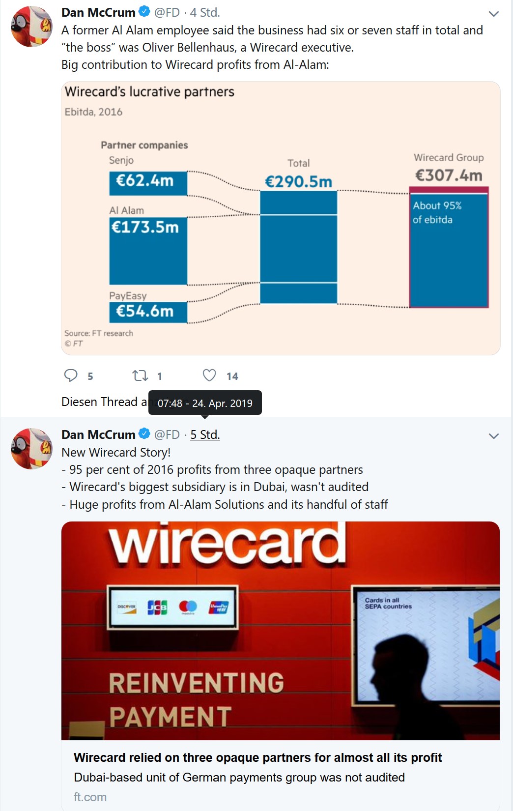 A former Al Alam employee said the business had six or seven staff in total and “the boss” was Oliver Bellenhaus, a Wirecard executive. Big contribution to Wirecard profits from Al-Alam: