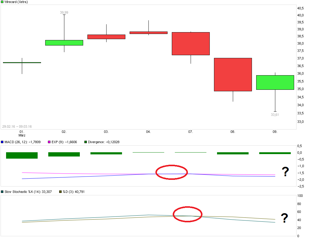 Also auch MACD ist nützlich, um anzuzeigen, ob deutlich überkaufte oder überverkaufte Zustände vorliegen, je nach Abweichung von der Null-Linie. Aber das Wichtigste ist natürlich der Triggerschnitt, der als Signalgeber dient. Von daher reicht es noch nicht, daß Wirecard mometan einen MACD im eher überverkauften Bereich hat, sondern es muß erst noch ein Schnitt nach oben erfolgen bis das Signal wirksam würde. Aktuell hat aber weder die Stochastik noch der MACD nach oben geschnitten, trotz des Rebounds heute. Schauen wir mal wie es Ende der Woche aussieht, wenn Draghi sein Füllhorn ausgeschüttet hat.