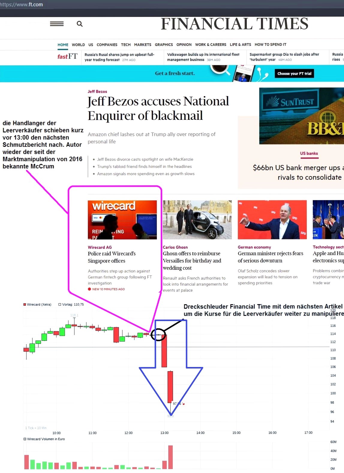 Na, wenn wundert es noch. Der bekannte Auftrags-Kurs-Killer Dan McCrum hat mit der dubiosen Schmierenpostille Finacial Times mal wieder den nächsten Artikel rausgehauen (www.ft.com/content/f6e8a58a-2b93-11e9-88a4-c32129756dd8 ) kurz vor 13:00 und natürlich auch jetzt wieder direkt prominent auf die Startseite gesetzt, um so schnell Wirkung zu entfalten und Kurse zu drücken. Und nachdem natürlich jedem bei der FT und auch dem Autor bestens bekannt ist wie der Wirecard Kurs auf diese Dreck&Lügengeschichten reagiert ( schließlich war der gleiche Autor nicht nur für die Hetz&Lügengeschichten gegen Wirecard in den letzten Tagen verantwortlich, sonden auch schon 2016 bei der FT aktiv mit den Lügen- Geschichten, die anschließend von der deutschen Staatsanwaltschaft als eindeutige Marktmanipulation von Leerverkäufern verurteilt wurde). Wenn also die FT eine bekannte mainpulierende Dreckschleuder wie Dan McCrum immer weiter diese Lügenartikel schreiben läßt (und die Kursreaktion kennt), dann ist für mich sie Sache zu 99,999999% klar hier ist konzertiertes Vorgehen vorhanden um Kurse hier wieder zu manipulieren durch die FT. Andernfalls würde der Herausgeber so einen Schreiberling längst entfernen. Aber da hier Leerverkäufer Milliarden verdienen mit dem Bashen gegen Wirecard, dürfte da auch dicke Krümmel davon wieder beim Autor und dessen Zeitung landen. Ach, Verbrechen zu begehen als FakeNews Postille ist halt viel schöner als Anzeigen zu schalten und ehrlich Geld zu verdienen. Das peinliche ist aber, daß immer wieder Leute sich davon verrückt machen lassen und schnell die Aktie verkaufen, sobald diese Artikel kommen auch wenn das schon zum x-ten mal passiert und alles bislang als Lüge der FT enttarnt wurde. MAn sollte wirklich mal genauer die Kontobewegungen die bei McDrum zuletzt eingegangen sind. Schließlich ist er Wiederholungstäter: