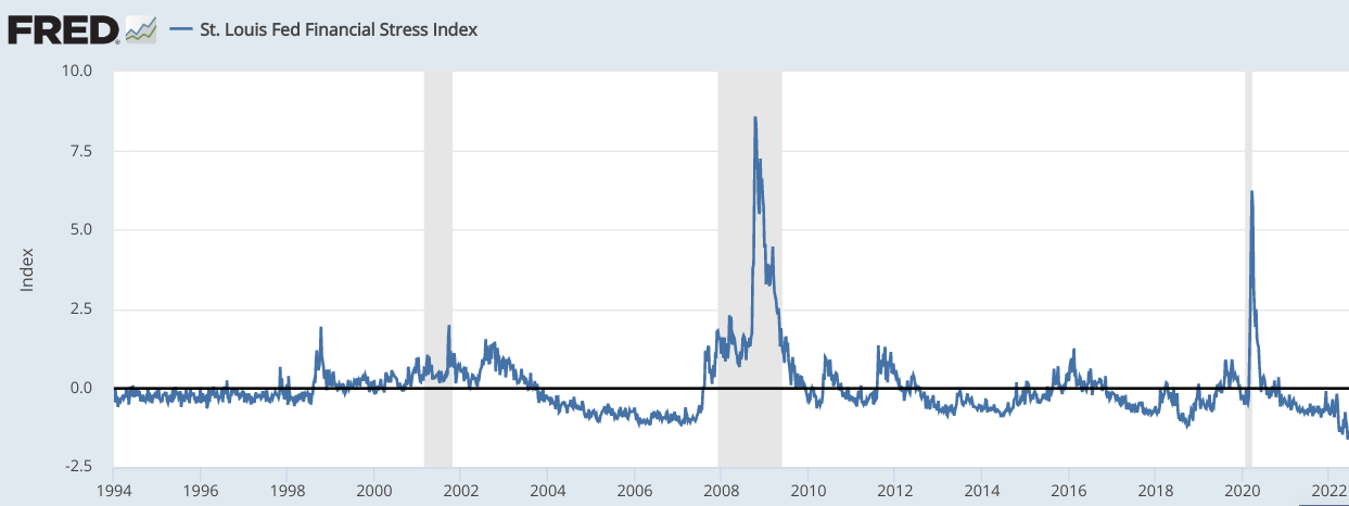 unten: In die Berechnung des St. Louis Fed Financial Stress Index, kurz STLFSI genannt, fließen sieben Zinssätze, sechs Spreads und fünf andere Indikatoren ein. Der Index wurde 1993 entwickelt und veröffentlicht. Der Grundwert des Index beträgt 0, damit gilt eine Notiz unter Null als ein Zeichen von wenig Stress und eine Notiz oberhalb der Null Linie als ein Zeichen von anwachsenden Stress in den Finanzmärkten.
