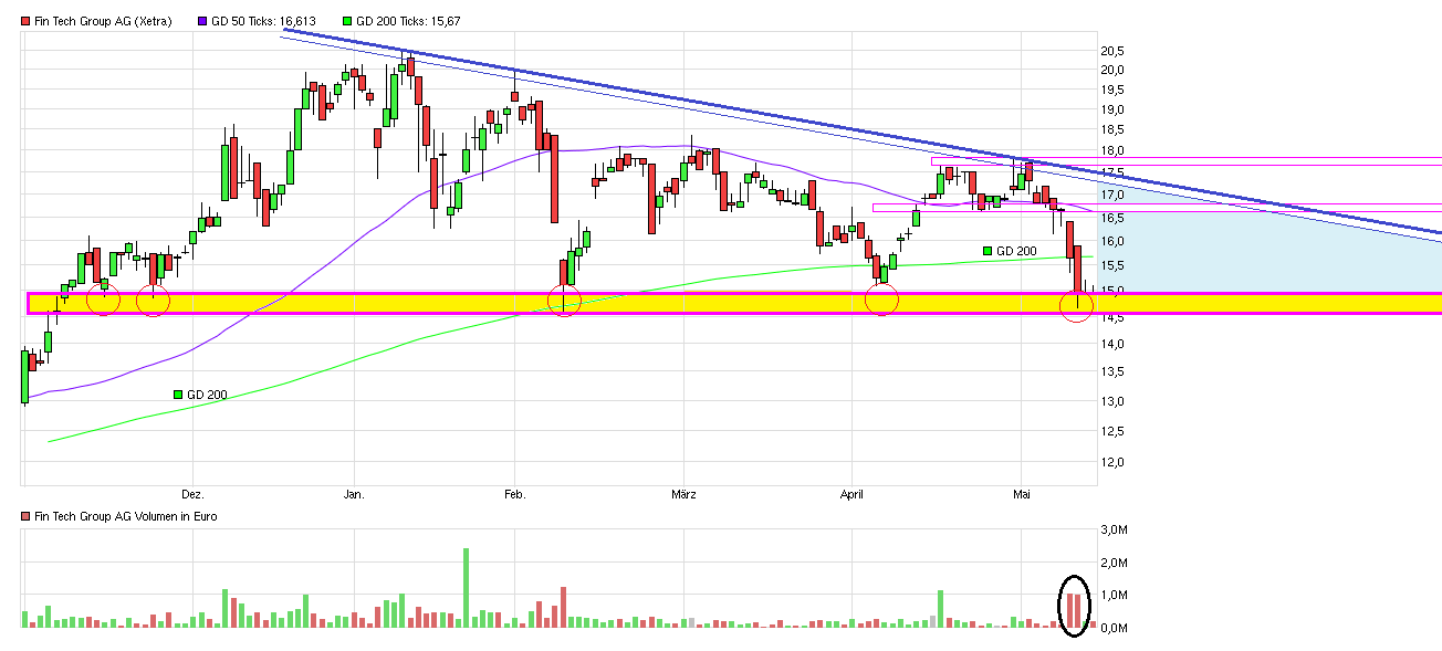und dabei auch größere Abgaben. Inzwischen ist man klar unter der SMA200 und es steht die wichtige horizontale Unterstützung um die 14,50 auf dem Prüfstand. Jüngst hatte man sich in Frankfürt Investoren präsentiert. ( ".. Ende Mai stehen bei der Fintech Group die Zahlen für 2015 an.... Negative Überraschungen scheint es bei den Zahlen nicht zu geben. Auf einer Konferenz in Frankfurt macht Vorstandschef Frank Niehage deutlich, dass der Turnaround geschafft sei. Die Zahlen könnten eventuell auch einen Tick über der Prognose liegen..." )