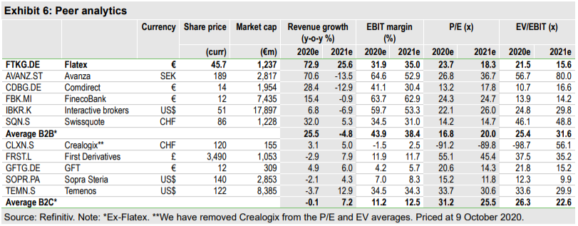das KGV 2021e der Flatex liegt unter den durchschnittswert der B2B-peers (Ø=20,0x) und der B2C-peers (Ø=25,5x, ex Crealogix)
