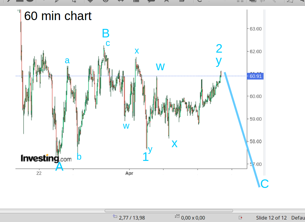 Wenn die 62,25 überschritten werden, ist Variante 2 klar bevorzugt. Der Anstieg sollte dann in den Bereich von 62,6-63,8 laufen und dann zur C nach unten sacken oder nach einer Korrektur noch etwas höher steigen, bevor die C kommt.