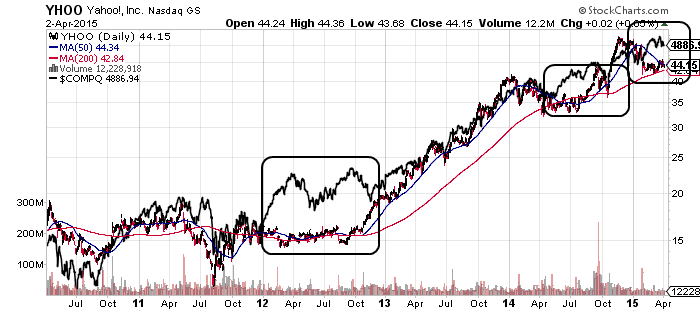 c) Das 2. Szenario beinhaltet die Erwartung (relativ) guter Nachrichten in der bevorstehenden Berichtssaison. Sollten die Zahlen (insbesondere von Alibaba) unterhalb der Erwartungen liegen und die Kurse somit keine zusätzlichen Impulse erhalten, verschiebt sich alles auf den Zeitraum ab Ende Juli 2015. Bis dahin dürfte es dann wohl auch keine frei handelbaren "echten" Yahoo!-Aktien mehr auf dem Markt geben und die Preisfindung verbleibt einzig bei den Buchmachern (bzw. Derivatehändlern). In diesem Szenario ist dann schließlich alles möglich ($20 bis $100) und nichts mehr vorhersehbar. Es wäre schlichtweg die Endphase der aktuellen Machenschaften, wo man vergeblich nach dem Sinn oder Unsinn der Bewertung einer Aktie sucht...