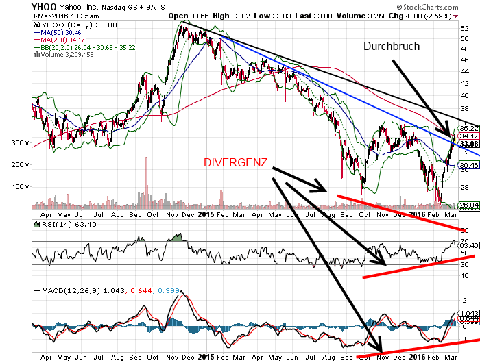Wer ist das, der Yahoo! seit über einem Jahr am weiteren Rückkauf von Aktien zu diesen Konditionen hindert? Warum sind die Banken in den letzten 2 Quartalen derart heftig in Yahoo! investiert und wer leiht bei dieser Unterbewertung über 60 Mio. Aktien an die Shortseller aus? Das geht definitiv nicht mit rechten Dingen zu und wenn jetzt dem (nachgewiesen) unfähigsten CEO aller Zeiten, der seit 3,5 Jahren kein einziges seiner ursprünglichen Ziele erreicht hat, noch einmal das Vertrauen ausgesprochen wird, dann bleibt einem wirklich nur Kopfschütteln und die Abkehr von diesem Wert übrig. Bei Yahoo! hat man den Bock zum Gärtner gemacht und obwohl dieser das auch noch nachweislich (mit einer unterirdischen Leistung) belegt hat, lässt man ihn jetzt weitermachen? Marissa Mayer hat ja am Donnerstagabend in einem Interview den Wunsch geäußert, noch weitere 3 Jahre Yahoo! führen zu dürfen, um den Turnaround zu schaffen. Was soll das für einen Turnaround werden? Sie hat Yahoo! in die Sackgasse gefahren, die zudem eine Einbahnstraße ist! Da gibt es nichts mehr außer dem Crash am Kopfende, und genau den gilt es jetzt zu verhindern, indem man die verbliebenen Einzelteile von Yahoo! durch gute Verhandlungstaktiken und kluge Veräußerungen in fähige Hände legt. Alles andere wird am Ende des Tages auch noch das Bankguthaben und die Beteiligunen auffressen, wenn sie weiter irgendwelchen Schrott zu überhöhten Preisen einkauft, um fähige Mobilfunk-Entwickler zu engagieren, die eine Video-App ohne Sprache programmieren, die schon in der 1. Woche nach Erscheinung floppt!