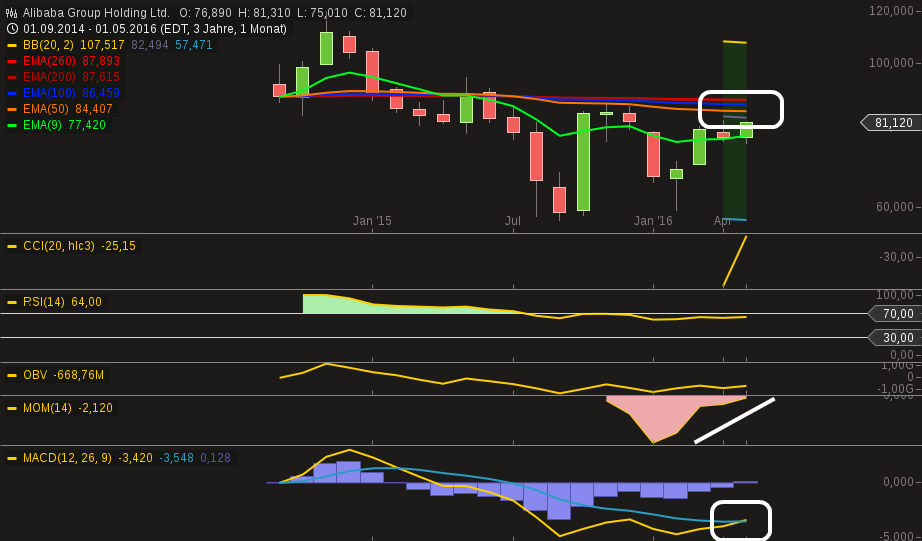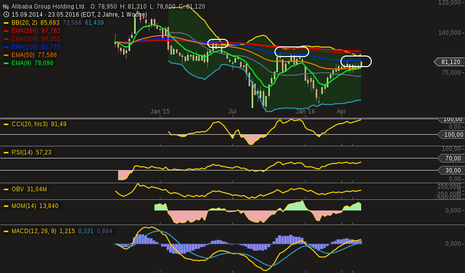 Die 50-Tage-Linie ist bei BABA noch immer nur knapp overhalb der 200-Tage-Linie. Es ist übrigens das allererste Mal, dass man das seit dem IPO beobachten kann. Wegen mir kann Alibaba nun täglich um 3% steigen und unsere Krücke hinter sich her ziehen, bis diese wiederum irgendwann ihre latente Unterbewertung abbauen kann.