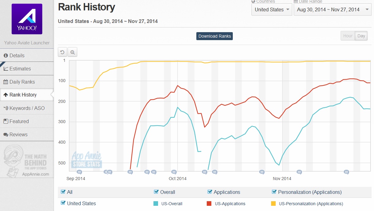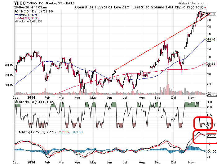 Somit erwarte ich ab kommender Woche in einem allgemein etwas schwächelnden Markt eine deutliche Gegenbewegung von Alibaba (und Yahoo!), die bis (kurz vor) Weihnachten anhalten dürfte, ab KW50 dann auch in einem allgemein besseren Marktumfeld. Ich halte auch an meinen Jahreszielen für den Dow Jones (18.172) und den DAX (10.358) vom 09.10.2014 fest. Alibaba wird bis Mitte Dezember einen Wert von ca. $136 erreichen, bis Jahresende aber wieder ein paar Dollar abgeben ($130). Bei Yahoo! gehe ich von einer (mindestens) ebenso guten Entwicklung aus: Bis Mitte Dezember erwarte ich hier Kurse von ca. $63, bis Jahresende sogar $80, weil bis dahin auch die Steuerproblematik geklärt sein dürfte bzw. noch die eine oder andere Übernahme bekanntgegeben wird. Das wird Yahoo! (gegenüber Alibaba) überdurchschnittlich abschneiden lassen und den Wert ordentlich nach oben pushen. Auf diesem Niveau sollte man aber auch Überlegungen anstellen, komplett auf Alibaba umzuschichten, wenn man nicht an ein unfassbares Comeback von Yahoo! (Kerngeschäft) in 2015 setzen möchte...