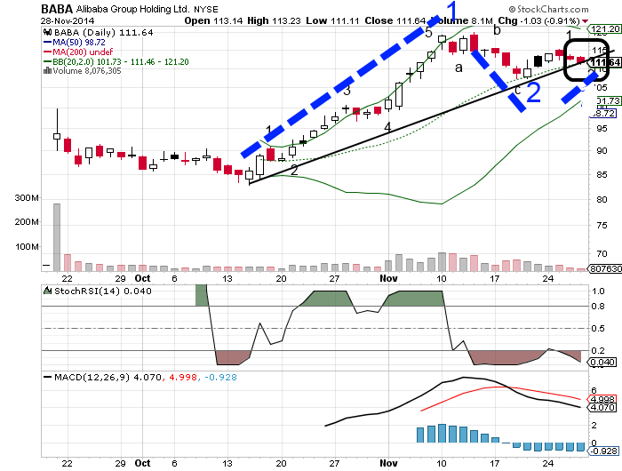 Die Amerikaner haben mit Alibaba nun die Möglichkeit, Gewinnmitnahmen aus einer Marktregion direkt in ein andere Marktregion zu investieren, und zwar ohne die Börse wechseln zu müssen. Mit den (guten) Ergebnissen des Black Friday und des Cyber Monday werden die bei Amazon in den letzten 2-3 Wochen verdienten Gelder womöglich (im fliegenden Wechsel) direkt in Alibaba investiert und sorgen dann dort für die nächste Rallye auf dieser Seite, während bezüglich Amazon Berichte gestreut werden dürften, dass man trotz des Weihnachtsgeschäfts am Ende des Quartals mit einem Minus rechnen muss und diesen Wert damit (gleichzeitig) wieder Richtung Süden schickt. Nach 2-3 Wochen wird das Spiel dann wieder in die entgegengesetzte Richtung verlagert, z.B. bevor Amazon seine (guten) Zahlen für das Weihnachtsgeschäft bekannt gibt. Ich würde daher auf das Motto "Sell on good news" setzen und genau beobachten, ob man hier mittelfrisitg einen entsprechenden Zusammenhang tatsächlich ausmachen kann. Auch Gelder, die in andere (gut gelaufene) US-Werte investiert waren, könnten für dieses Wechselspiel (z.B. für eine gleichzeitige Wette in Yahoo!) entsprechend verwendet werden. Bei Apple würde ich (im Gegensatz zu Amazon, bei denen es wieder bergab gehen dürfte) eher auf eine Seitwärtsbewegung in den nächsten 2 Wochen setzen: Zunächst einen kleinen Rücksetzer ab Dienstag nächster Woche bis Freitag (in einem allgemein etwas schwächeren Marktumfeld), bevor dann ab dem 08.12. eine anschließende Erholungsphase (bis Weihnachten und darüber hinaus) einsetzen wird. Am Jahresende sehe ich Apple bei nicht über $127.