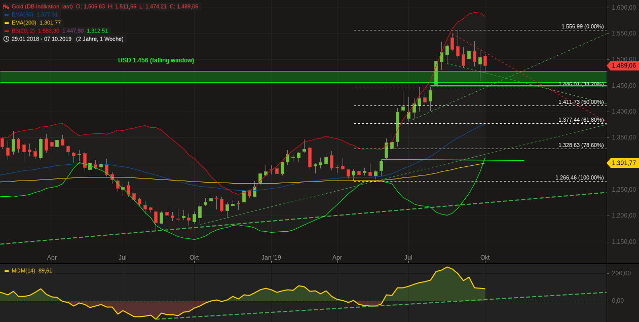 Somit wäre in der kommenden Woche mit konsolidierendem Kursverhalten zu rechnen. Unterstützend dabei sind die EMA 200, die der aktuellen Kerze Halt bietet bzw. bei Kursabgaben die EMA 50, die sich bereits an das 38er-FIBO herangekämft hat.