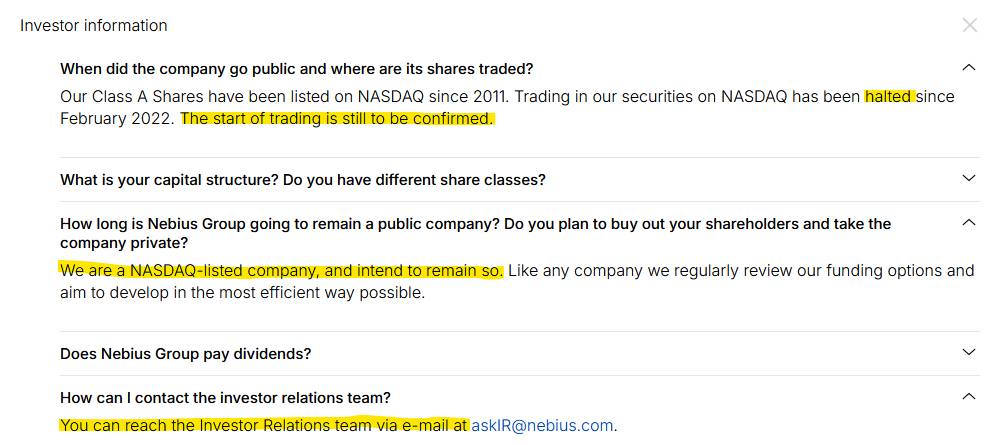 @Naggamol - auf der Webseite der Nebius Group findest Du u.a. die nachstehend abgebildeten Infos. Anders als wir hier im Forum kann man Dir vielleicht unter der ebenfalls dort eingetragenen Email-Adresse mit Deiner Frage weiterhelfen, wann und wie es mit den Aktien weitergeht.