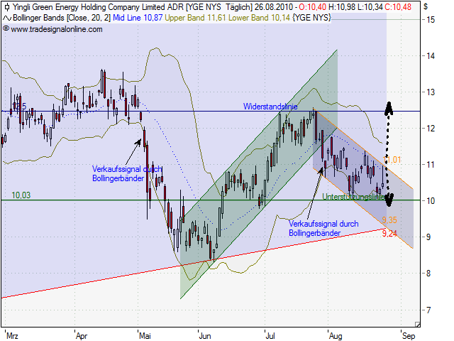 Hab heute mal ein paar Charts analysiert, unter anderem auch Yingli Green. Es sieht im Moment eher bearish aus. Yingli befindet sich momentan in einem kurzfristigen Abwärtstrend. Heute erneut am der oberen Linie des Abwärtstrend abgeprallt! (kein gutes Zeichen). Bezüglich dem vorherigen Posting: Es wäre möglich, dass es ein Doppeltop gibt, allerdings vermute ich, wird der Abwärtstrend stärker sein. Unterstützung findet die Aktie im moment bei ca. 10$. Der MACD Indikator ist ebenfalls im Abwärtstrend und gibt eher negative Signale. Die Bollingerbänder generierten vor ca. 1 Monat ebenfalls ein Verkaufssignal und wenn man den Chart anschaut, sieht man auch, dass die Bollingerbänder oft richtige und gute Signale gaben. (Hab ich im Chart mal gekennzeichnet, damit man es nachverfolgen kann. Kurzfristig (1-2 Tage) gehe ich von fallenden Kursen aus. Hierzu noch mein Chartbild: