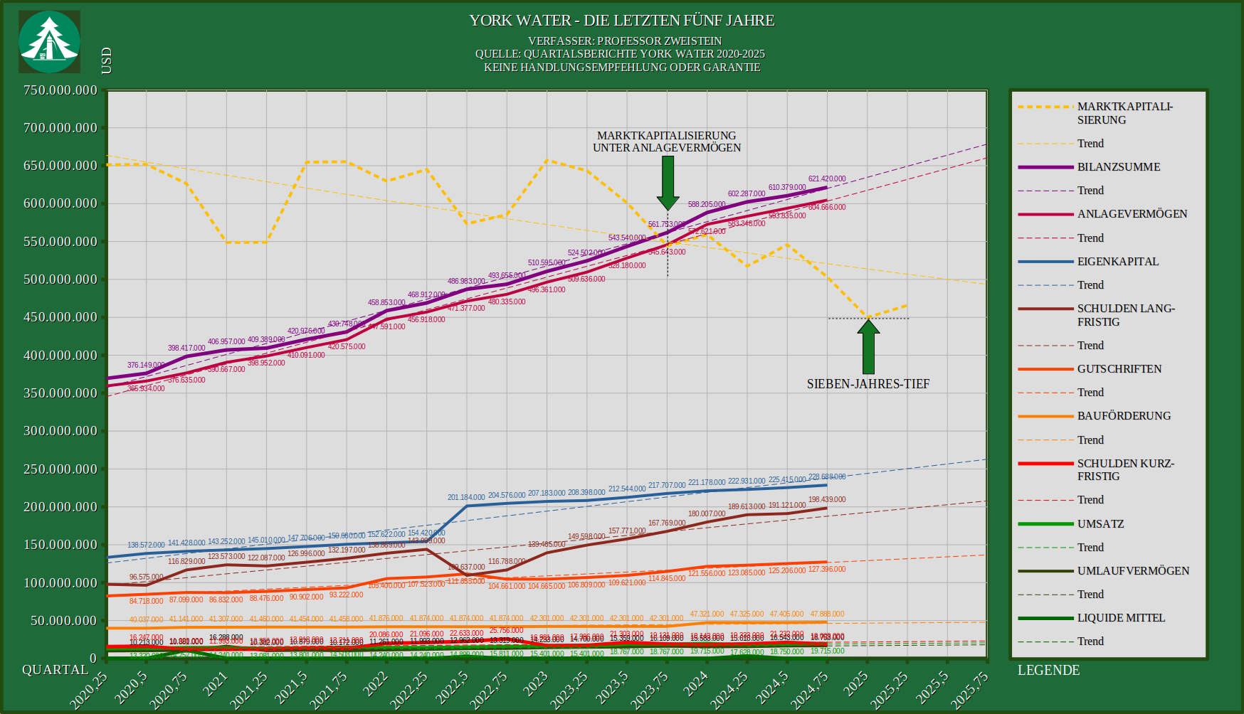 Meine Auswertung hat ergeben, dass die Marktkapitalisierung im Januar 2025 ein Sieben-Jahres-Tief aufweist. Sie durchkreuzte das Anlagevermögen der Gesellschaft irgendwann Ende 2023 nach unten und liegt inzwischen weit unter dem Durchschnittswert. Dabei sind die Zahlen ungebrochen konstant. Der Immobilienbesitz der Gesellschaft ist beträchtlich und nimmt beständig zu. Im Q4 2024 wurden drei Leitungsnetze gekauft. Die Erneuerung eines Dammes ist ebenso abgeschlossen. Das Eigenkapital und die Dividende steigen beständig. Kurzfristige Verschuldung, Umsatz und Umlaufvermögen gehen Hand in Hand und sind gemessen an den anderen Vermögenswerten sehr gering. Die langfristige Verschuldung steigt beständig und dient der Finanzierung von Immobilien, so dass kontinuierliche Gegenwerte hierfür bestehen, die wesentlich höher als die Verschuldung sind. 2022 gelang eine Tilgung. Zudem bestehen Gutschriften durch Kunden und eine Art Baufinanzierung gegen Gegenleistung, die kontinuierlich ist.