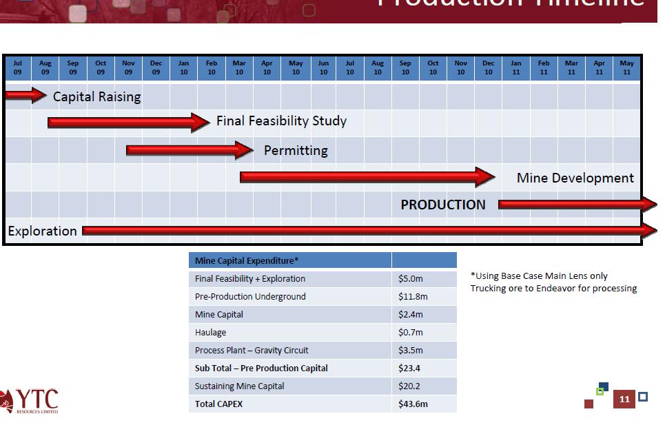 YTC has commenced feasibility studies (scoping level) on integrating the Nymagee deposit as a Stage 2 expansion to the development of the Hera gold-base metal deposit (Stage 1). Work to date includes initial metallurgical studies indicating that the Nymagee ore is capable of producing high-quality copper concentrates at good recoveries (>95% Cu recovery). However, test work for Pb, Zn and Ag is still required. We expect similar metal recoveries to Hera, that being ~91% recovery for Pb, ~90% recovery for Zn and ~47% recovery for Ag, all at high payabilities. YTC plans to recommence exploration and extensional drilling at Nymagee in January 2012.